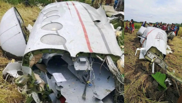 現場畫面顯示,小飛機似乎墜毀在一片田地,機身嚴重碎裂。 除了機上4人還有一頭水牛死亡。