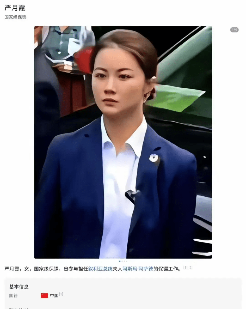 出生于河南武術世家,嚴月霞從小就展現出了對武術和搏擊的濃厚興趣,憑借著超乎常人的毅力和努力,她在武術領域不斷深耕,曾進入少林寺深造,練就了一身本領。 她以優異的成績考入北京體育大學武術專業,更曾打敗過5位日本空手道冠軍。 武林中人皆對這位天才欽佩不已,尊稱她為“河南花木蘭”。 嚴月霞成年后曾參軍,軍旅生涯更讓她學會了射擊、徒手搏擊、反監視防護等技能,從單純的武術愛好者成長為全方位的格斗高手。 退伍后,嚴月霞更成為中南海保鏢。 2023年杭州亞運會期間,嚴月霞迎來了職業生涯中的一項重大任務——隨護敘利亞第一夫人阿詩瑪,當時就因清秀絕美側顏,引起關注。