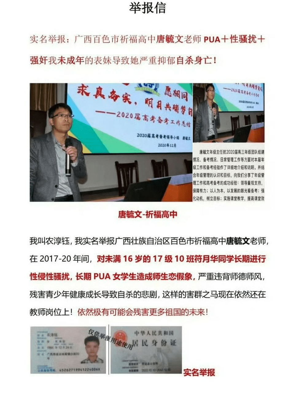 2月10日,廣西百色一高中教師唐毓文被舉報性侵當時仍未成年的女學生符月華,致其長期重度抑郁,最終自殺身亡。受害者女生小華的母親向《中國新聞周刊》透露,骲受女生前的遭遇,他們在整理其遺物時,發現小華在日記、聊天記錄提到唐某某多次借補課性侵自己,并對其進行言語威脅。