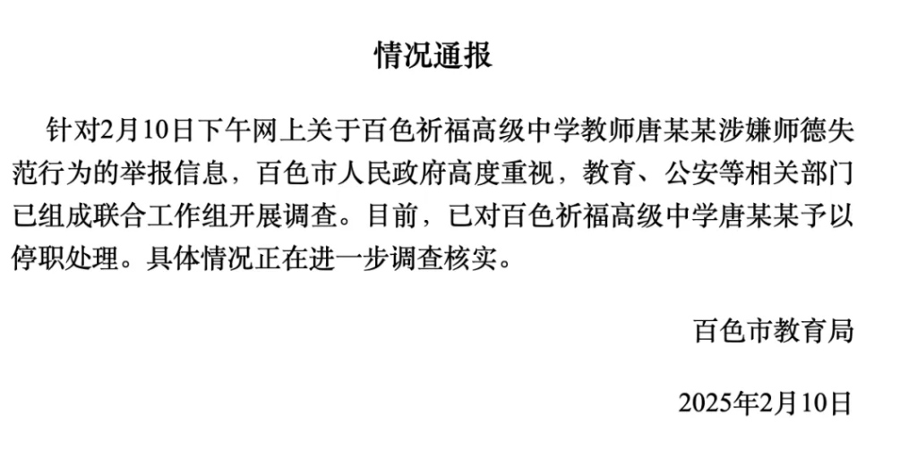 據當晚百色市教育局發布情況通報稱,針對2月10日下午網上關于百色祈福高級中學唐姓教師涉嫌師德失范行為的舉報信息,百色市人民政府高度重視,教育、公安等相關部門已組成聯合工作組開展調查。經初步核查,網上舉報情況部分內容屬實,部分內容仍需進一步調查核實。目前,已對百色祈福高級中學唐某某予以停職處理。公安機關已介入調查。對于唐姓教師的行為教育部門將進一步調查核實。