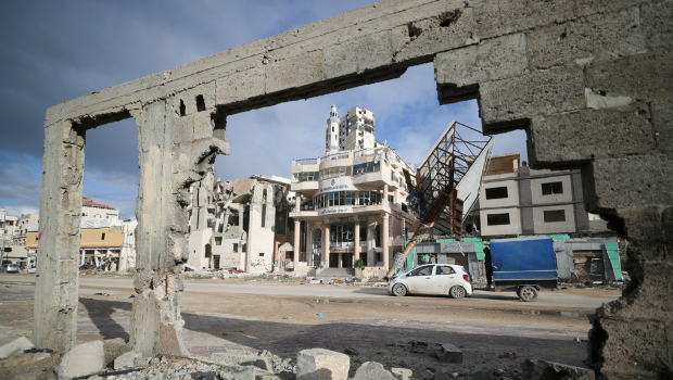 ▲加沙走廊大皇宮飯店(Grand Palace hotel)6日矗立于殘破的加薩市區,街上空無一人。(路透)