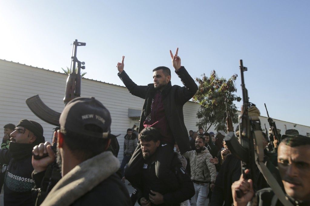 獲以軍釋放的巴人囚犯高舉勝利手勢。美聯社