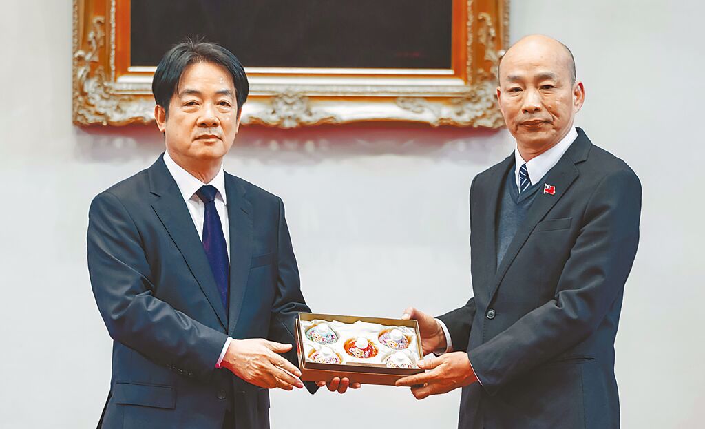 ▲賴清德召集“五院會商”,贈送“花開富貴五福臨門”紅花響杯5入禮盒給各院長。右為韓國瑜。(示意圖/資料照/總統府提供)