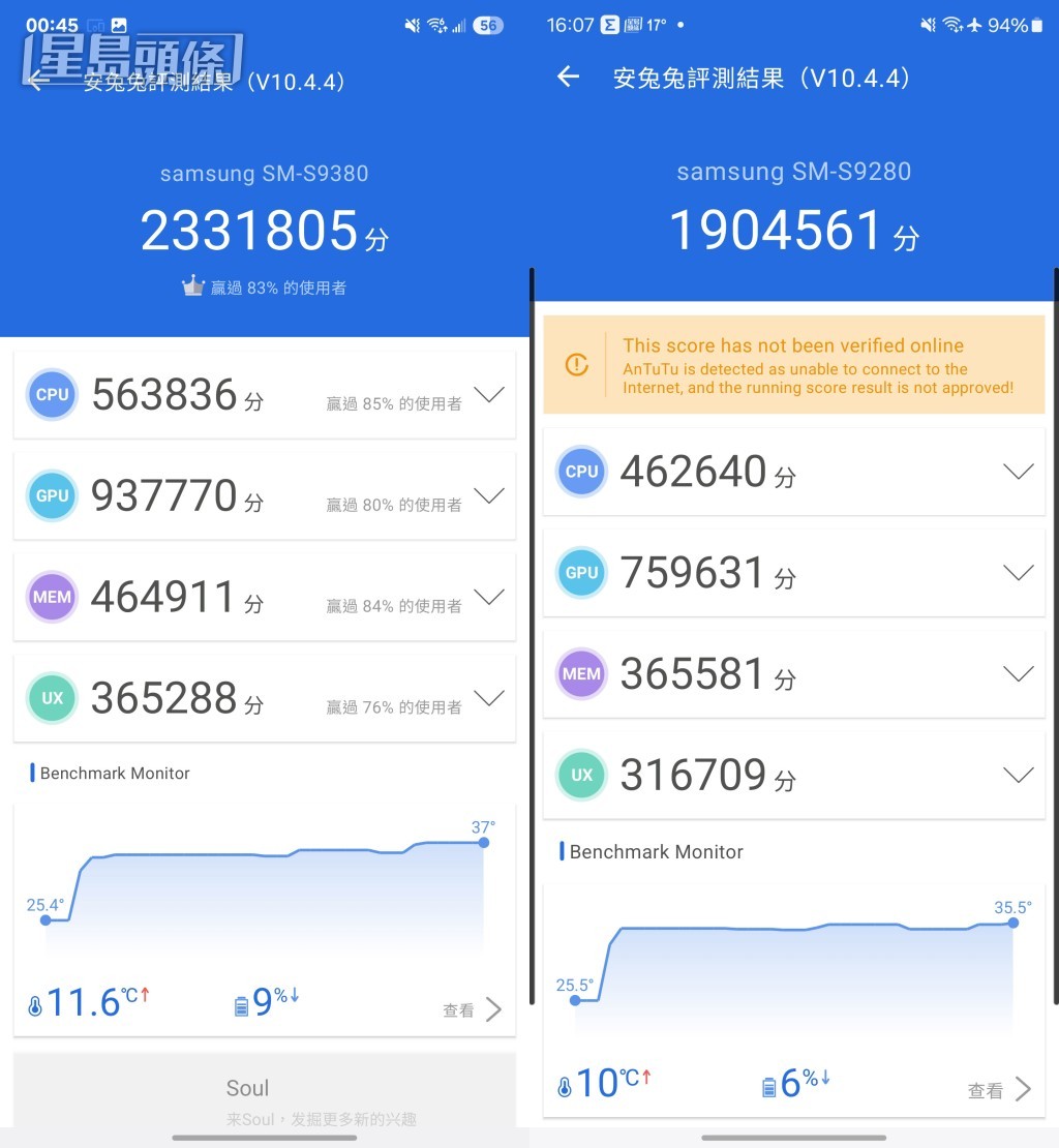 ▲Galaxy S25 Ultra(左)《安兔兔》跑分2,331,805,比S24 Ultra(右)高出40多萬分。