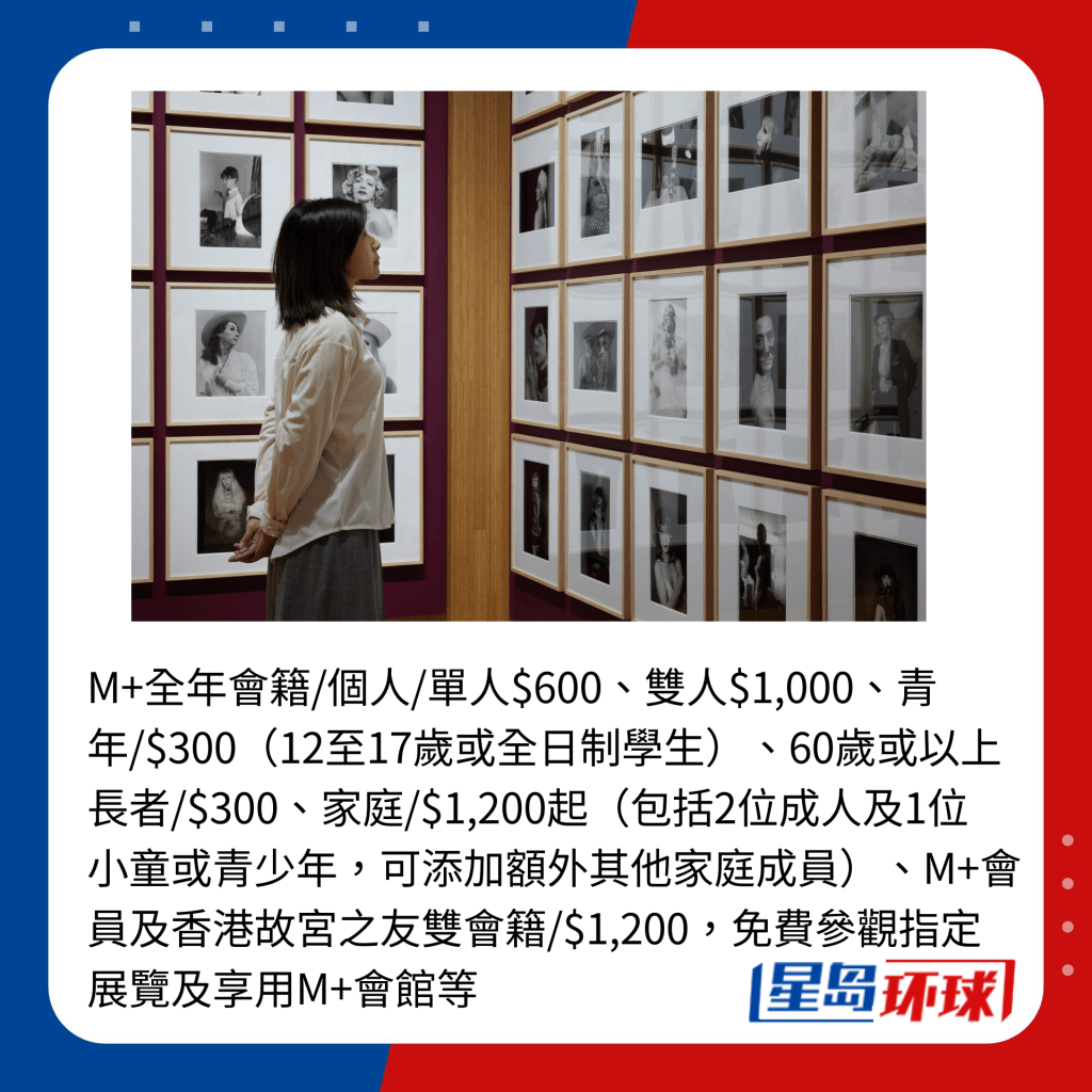 當代視覺文化博物館M+及香港故宮文化博物館,均設有不同類型的全年會籍,前者每個會 籍每年可獲贈3張免費特別展覽禮券,亦可優先購買展覽門票,以及7折不設上限選購正價門票或套票。后者的“香港故宮之友”會 籍則享全年不限次數參觀專題展覽、可獲適用于特別展覽的進場碼,參加會員專屬參觀時段等。若你是以上兩大博物館的捧場客,不妨申請M+會員及香港故宮之友雙會籍,所需費用為$1,200,雖等同兩個博物館的單人會籍費總和,但可享額外1個月會籍有效期。