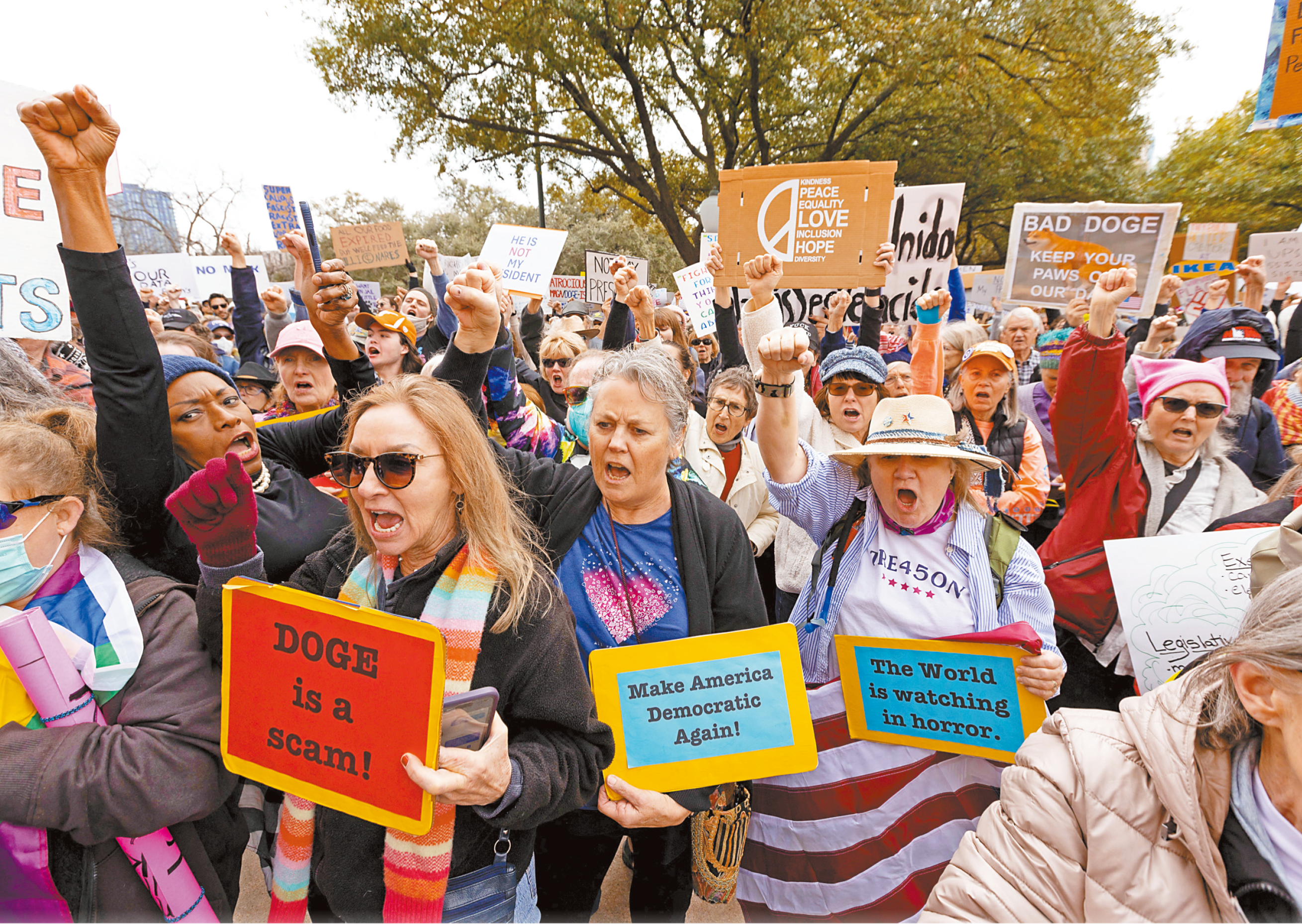 ▲德州的示威民眾舉著反對政府效率部 (DOGE) 的標語。路透社
