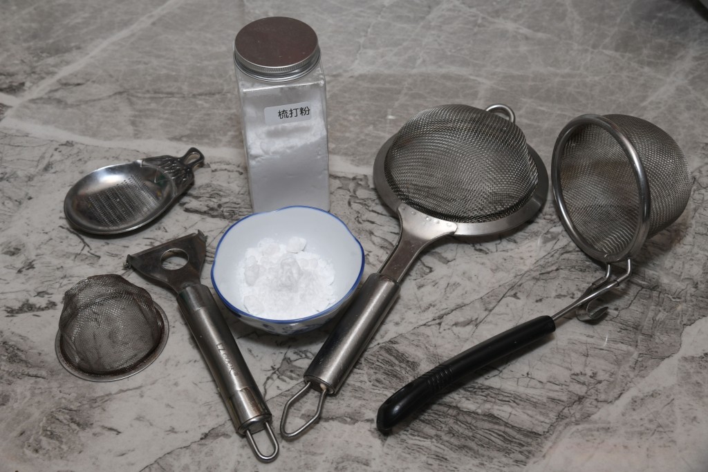 將梳打粉加入熱水中,放入不銹鋼籬及隔油板浸泡約10分鐘,便可去除污跡。謹記避免在不銹鋼表面加上酸性或堿性物質,例如檸檬汁或清潔劑等,因為這些物質可能腐蝕不銹鋼表面。