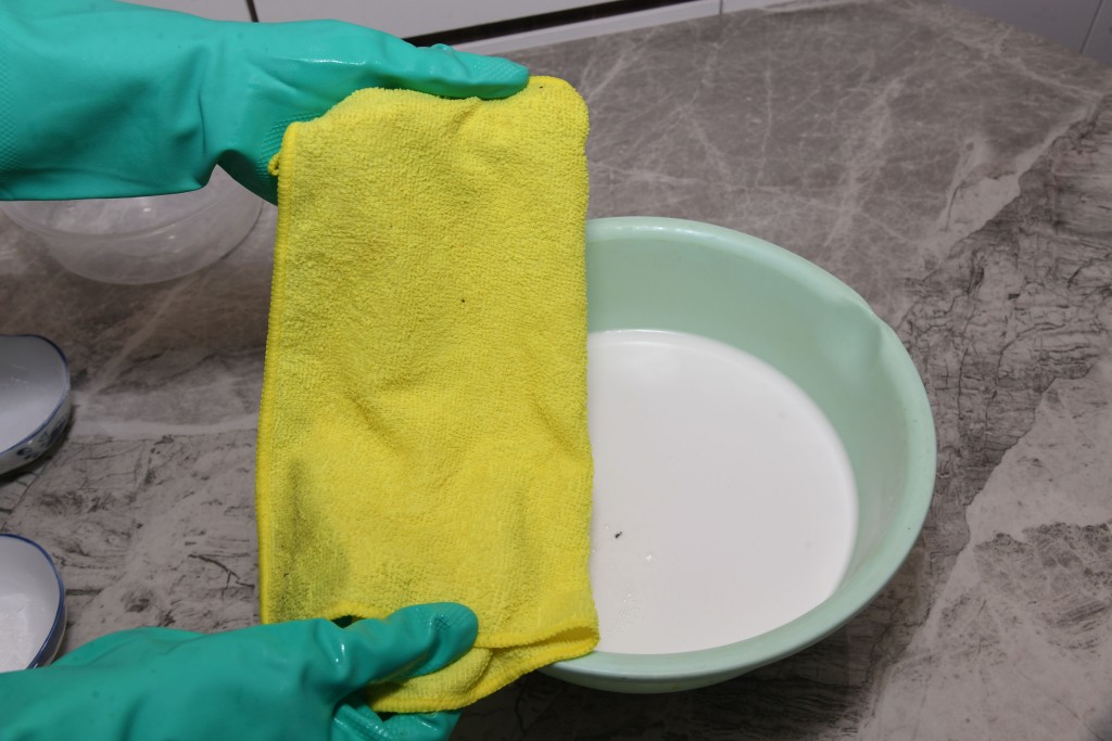 將過碳酸鈉加入攝氏45度暖水中,再將發霉或污糟毛巾放在水中浸泡,但謹記過碳酸鈉不可混合鹽酸、醋酸、氯系漂白水等清潔劑,會起化學作用產生氯氣,而過碳酸鈉是一種偏醶性清潔劑,使用時謹記帶手套操作。