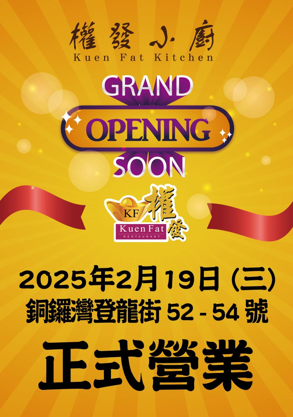權發小廚價格親民,每日供應多款菜式,深受市民歡迎,在短短數年間,一躍成香港兩餸飯店的龍頭,每逢繁忙時段,店門外都必定會出現人龍排隊幫襯。繼油麻地、佐敦及觀塘分店,權發小廚于月前在社交平臺上宣布店鋪將進駐港島區,選址銅鑼灣登龍街一地鋪,于今日(2月19日)起試業,而正式開業的日子則定3月5日(三)。