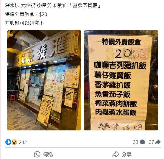 日前,有網民于社交平臺Facebook“荃灣人”群組發文,分享發現深水埗一間茶餐廳的外賣飯盒只售$20!從圖中所見,位于深水埗元州街、正對著麥當勞的“匯發茶餐廳”,推出特價外賣飯盒,每款僅售$20。特價外賣飯盒有多達6款可供選擇,包括咖喱吉列豬扒飯、薯仔雞翼飯、香茅雞扒飯、魚香茄子飯、榨菜蒸肉餅飯及肉松蒸水蛋飯。