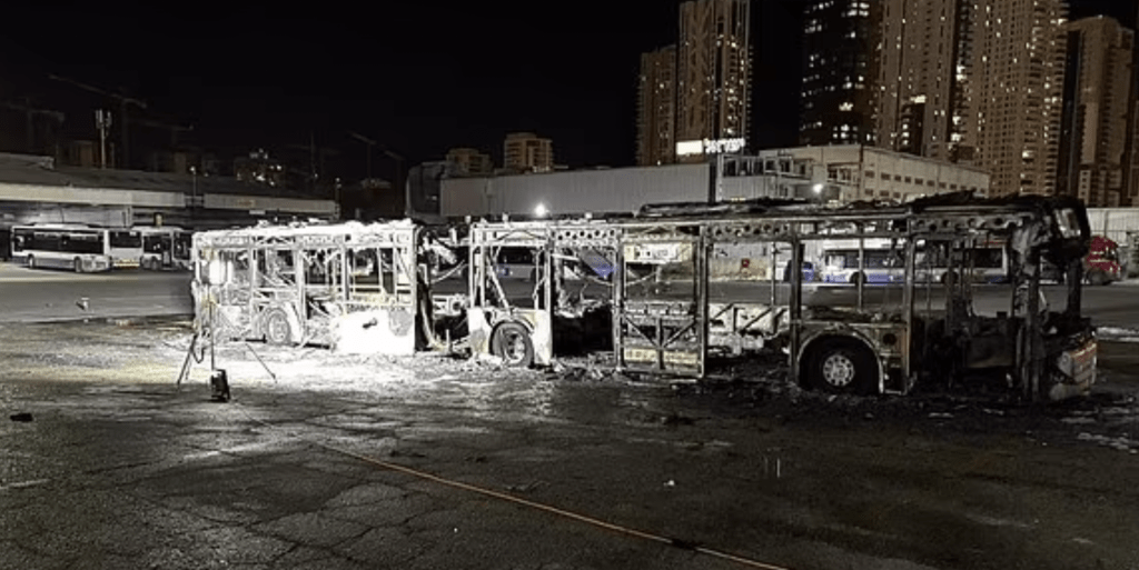 每日郵報,事件發生于當地晚上9時。目擊者拍攝的影片顯示,濃煙直沖天際,大火從市中心停車場內的巴士竄出,整輛車被猛烈火焰吞噬。警報聲響徹現場,許多民眾駐足觀看。
