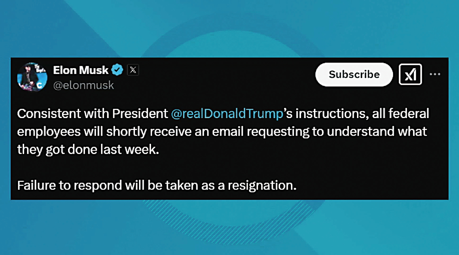 馬斯克22日公開宣布,230萬聯邦雇員將收到電子郵件,需要回復解釋自己的工作性質,未能在24日晚上11時59分前回復的人,將被視為自動辭職。
