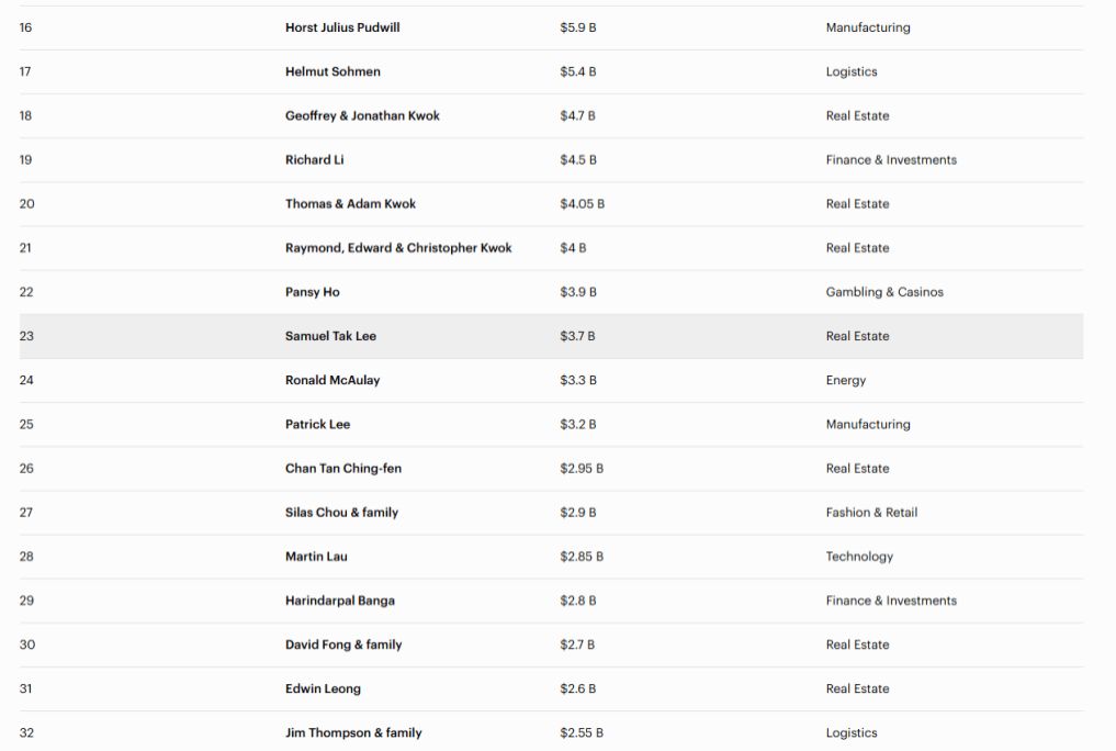華人置業創辦人劉鑾雄排第5位,較去年上升1位,身家達136億美元(約988億人民幣);新地主席郭老太鄺肖卿以身家120億美元(約872億人民幣)排第6位,較去年升2位。