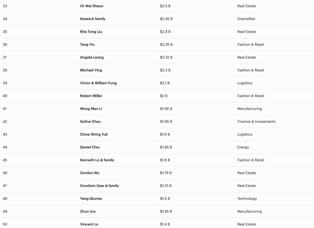香港50大富豪榜中,第二至第四位亦不變,其中恒地創辦人李兆基以292億美元(約2122億人民幣)排第2位,第三及第四位則分別為新世界主席鄭家純家族及李錦記集團的李氏兄妹,身家分別達195億美元(約1417億人民幣)及162億美元(約1177億人民幣)。