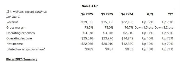 營收方面,同比大幅增長78%至393.31億美元,高于市場預期的380.5億美元,也超過英偉達上季度對自己的業績指引(375億美元);每股收益方面,非GAAP口徑下調整后同比增長71%至0.89美元,高于分析師預期的0.84美元;凈利潤220.66億美元,高于彭博綜合預期(209億美元)。