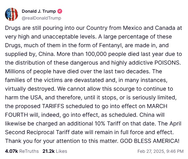 特朗普227日在自家社交媒體Truth Social發文,宣布此前提議對加拿大和墨西哥加征25%關稅,將如期于34日生效。另外,對中國亦將征收10%的額外關稅。