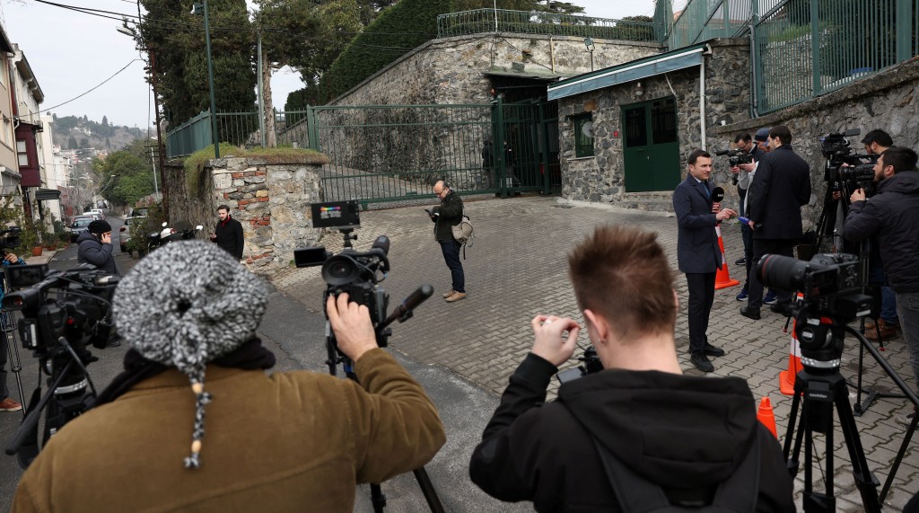 美俄代表27日在土耳其伊斯坦堡美國總領事館官邸會談,大批媒體在場守候。 路透社