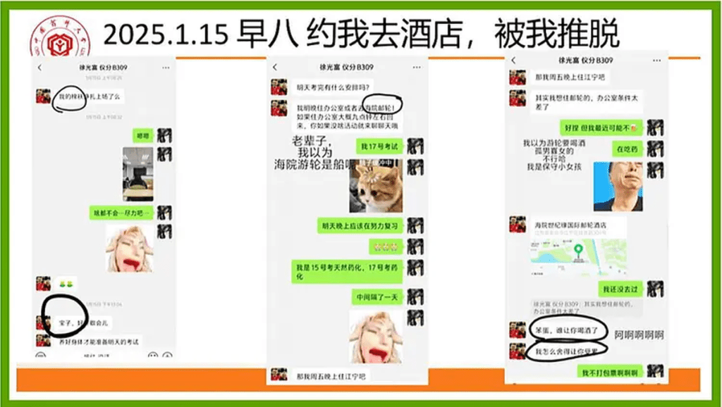 網傳消息爆料,南京中國藥科大學理學院化學系主任、副教授徐某某疑似性騷擾女學生,該學生將兩人大量聊天記錄曝光到網上,令無數網友看了后直呼受不了。舉報人制作PPT舉報,內容是該女生與徐某某的聊天記錄,顯示2024年9月至2025年1月17日該女生一直受騷擾。