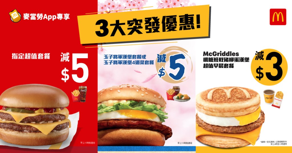 麥當勞優惠|即日起,麥當勞 App 再次帶來三款超值突發優惠!各款超值套餐大減 $5、玉子將軍漢堡套餐減 $5,McGriddles 早晨套餐亦可減 $3,從早餐到晚餐,全天候享受超抵的美味時光!