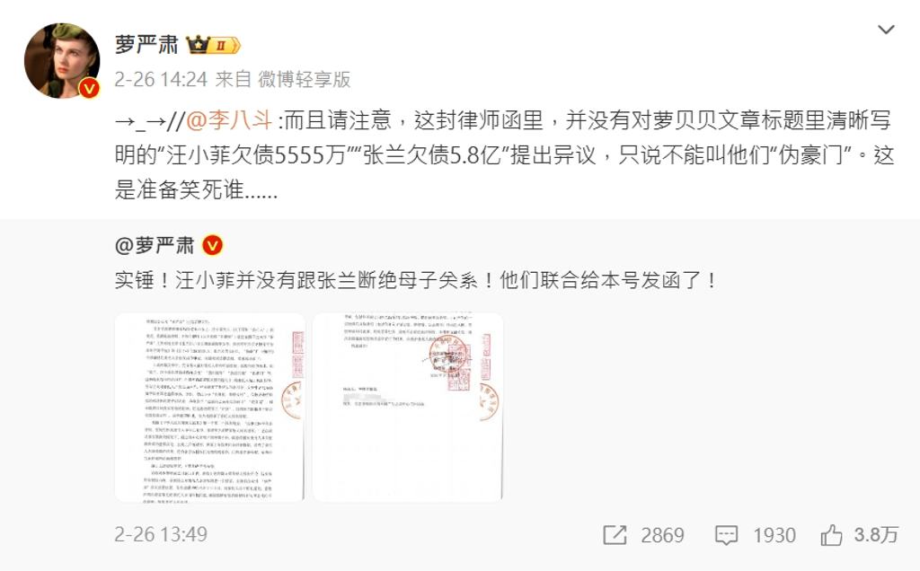內地網紅蘿貝貝26日在微博發文,“實錘!汪小菲并沒有跟張蘭斷絕母子關系!他們聯合給本號發函了”,她同時曬出證據,表示張蘭和汪小菲委托北京某律師事務所,對蘿貝貝在微信公眾號“蘿嚴肅”發出律師函,針對她先前在網上“張蘭汪小菲長期造謠侮辱女性,強烈呼吁抖音微博等平臺拿出應對措施”和“汪小菲欠債5555萬,張蘭欠債5.8億,‘偽豪門’全解析”中等文章,涉嫌損害張蘭和汪小菲的名譽。