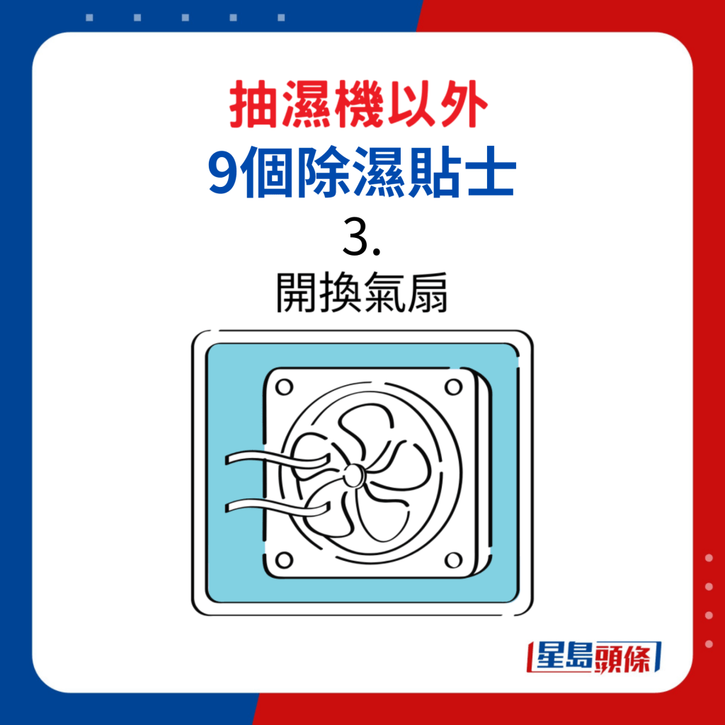 若選擇開啟換氣扇降低濕度,首先打開窗戶讓室外的空氣進入,接著選用氣扇模式,通過旋轉令空氣循環流動,有助將濕度降低。值得留意,如果室外濕度較高,可能產生相反效果。