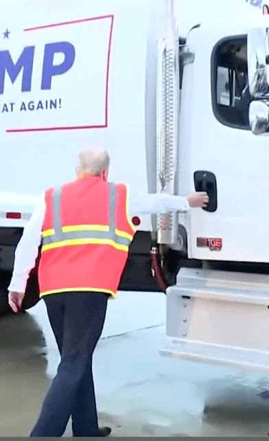 ▲2023 年 10 月特朗普在 “MAGA 垃圾車” 發布會上登車時,似乎僅靠右腿支撐自己,加深了外界對他健康問題的猜測。