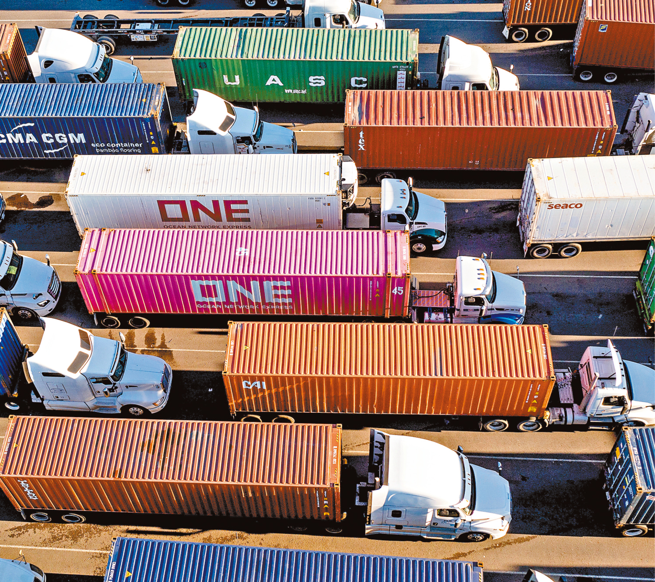 關稅戰開打勢必影響民生。圖為貨車排隊進入屋侖港口。美聯社資料圖片