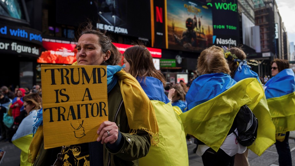 ▲2025年3月1日,烏克蘭社區成員和支持者聚集在紐約時代廣場,有人舉標語反特朗普。 美聯社