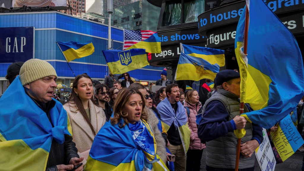 2025年3月1日,烏克蘭社區成員和支持者在紐約時代廣場集會。 美聯社