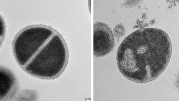 ▲左圖顯示未經處理、結構清晰的葡萄球菌;右圖是細菌遭受蛋白酶體(proteasome)制造的抗菌物質攻擊后,外膜破裂、內容物外泄。 Weizmann Institute of Science