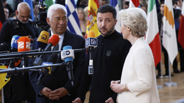 澤連斯基(中)出席歐盟特別國防峰會。
