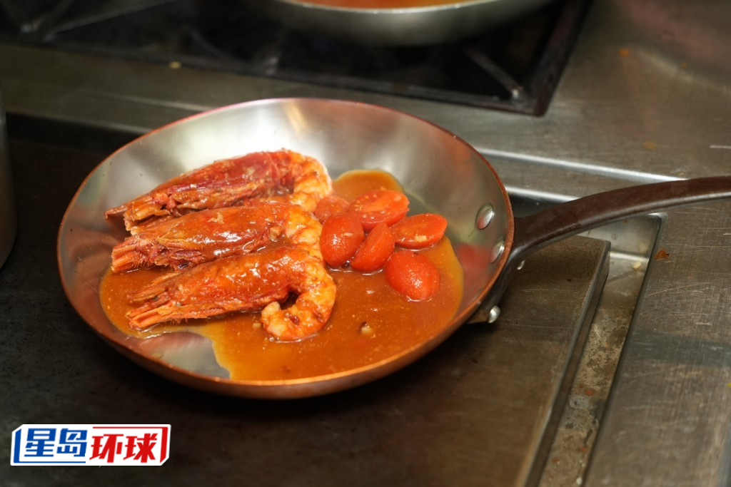 ▲紅蝦、醬汁及車厘茄要一起烹調。