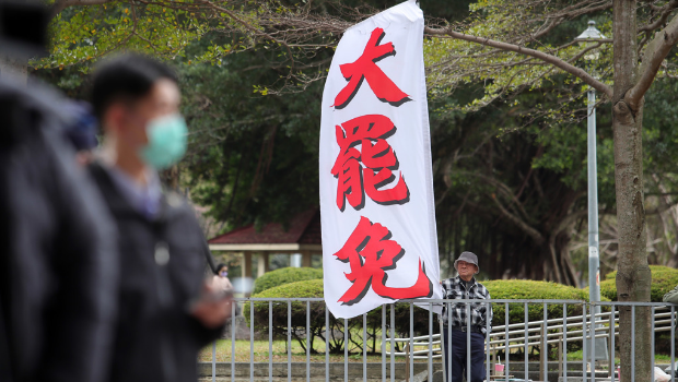 圖為民眾在民進黨中央黨部樓下高舉旗幟,要求黨主席賴清德對大罷免表態。