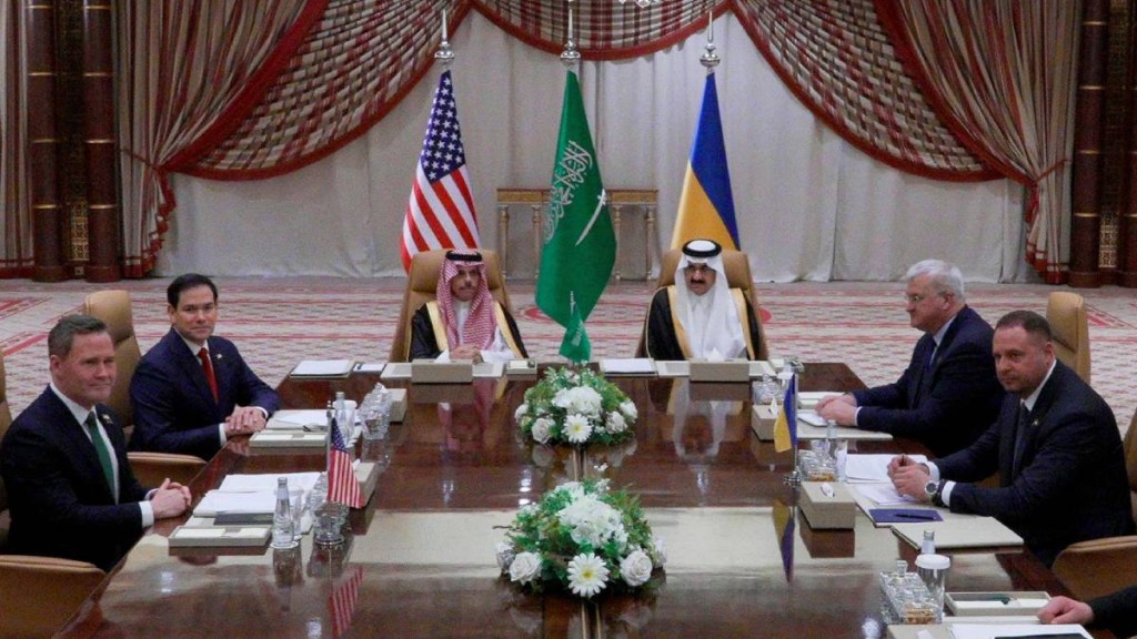 美國國務卿魯比奧(左2)在沙特阿拉伯與烏克蘭代表,商討俄烏戰爭?;鹗乱?。 路透社