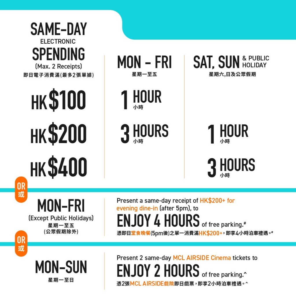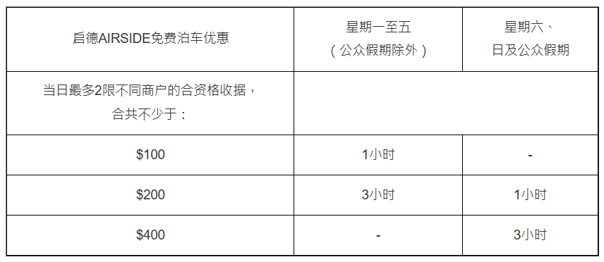 于啟德AIRSIDE消費滿指定金額,并以最多兩張不同商戶即日電子貨幣消費收據,可享以下免費泊車優惠: