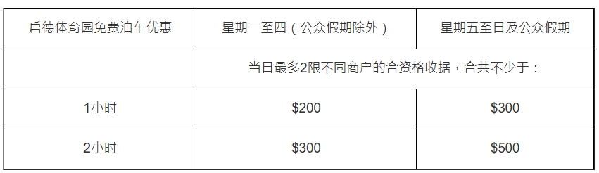 凡于啟德零售館消費滿指定金額,即可享有最多2小時免費泊車優惠,惟免費泊車優惠不適用于日泊車輛,大型活動及特定日子,詳情可以留意啟德體育園提前公布。