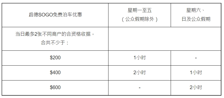在啟德SOGO雙子匯消費達指定金額,憑當日最多2張不同商家之電子貨幣消費發票(每張發票最少$100),即可獲得免費泊車服務。