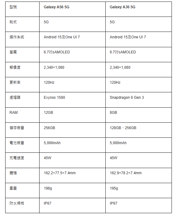 ▲Galaxy A56 5G(右)及A36 5G(左)均用上6.7吋FHD+螢幕,外形近乎一模一樣。