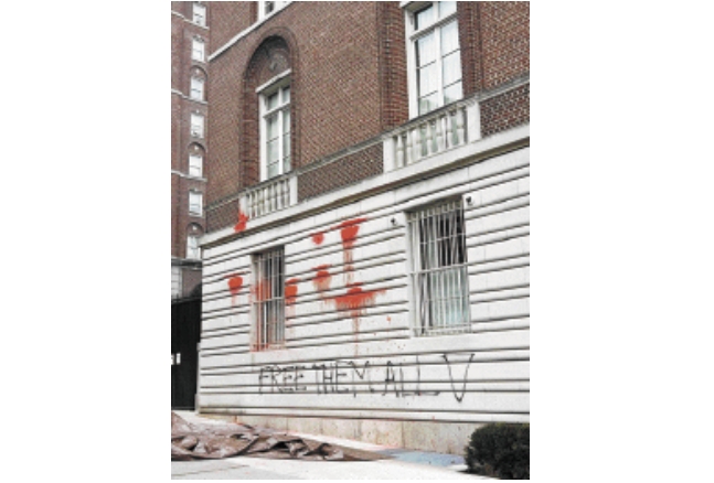 ▲哥大校長官邸被扔紅色油漆氣球。 X圖片