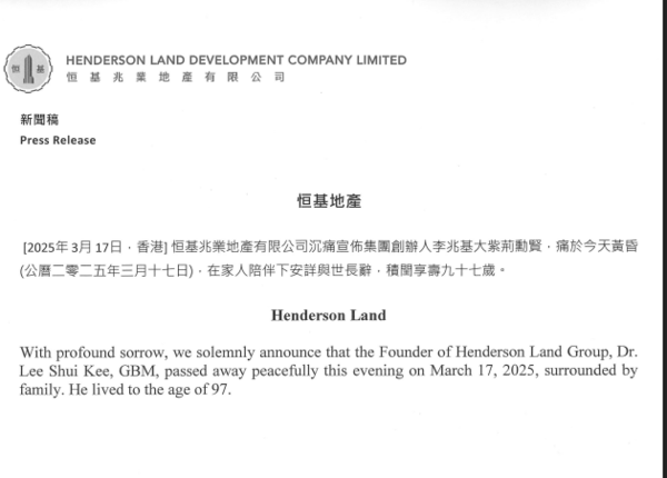 恒基兆業宣布,集團創辦人李兆基于今天(17日)黃昏,在家人陪伴下安詳與世長辭,積閏享壽97歲。李兆基出殯儀式的舉行日期,一俟家族安排妥當后,將會另行公布。