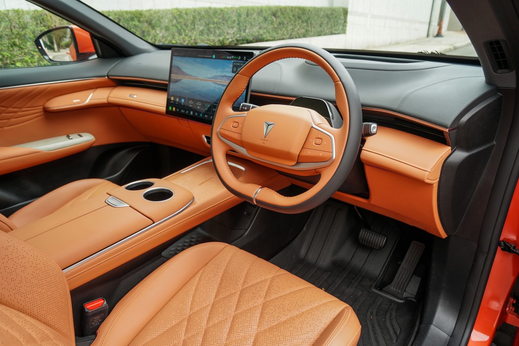 環抱式車廂用料與造工皆上乘,不事先張揚,還以為置身于日系豪華SUV內。迎合顧客不同喜好,寬敞座艙還有橙、黑兩色配搭,日光從全景玻璃天窗直透入內,份外愜意開揚。座椅以纖維皮革包裹,零重力運動前座附設電控透氣功能,駕駛席兼具腰背承托和記憶系統。豐富配置還有多功能皮軚環、AR-HUD擴增實境投射儀錶、左右轉動15.6吋中控屏幕、PM2.5雙區恆溫冷氣連后排觸屏調節、多媒體資訊娛樂導航系統及語音助理、無線Apple CarPlay、Auto Hold電子手掣、手機無線充電、前后USB充電、14喇叭音響、64色氣氛燈、360泊車鏡頭、全車安全氣袋與L2級智能駕駛輔助系統等,而Deepal S07更取得2024 Euro-NCAP及C-NCAP雙五星安全評級。行李箱容量435升,放平后座椅可進一步擴大,下載手機App更可遙距掌控車輛。