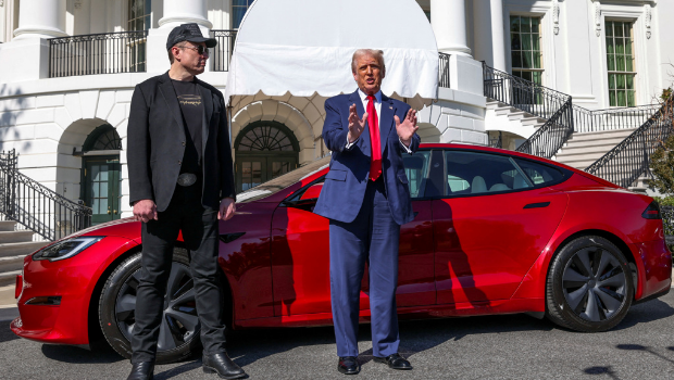 ▲電動車大廠特斯拉老板馬斯克11日把特斯拉新車運到白宮,與特朗普一同賞車。 (路透)