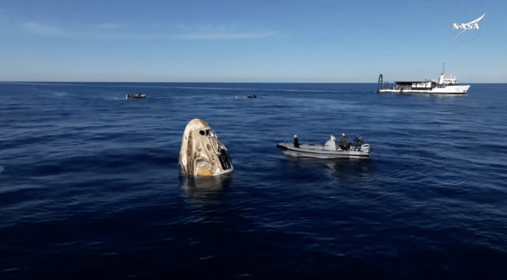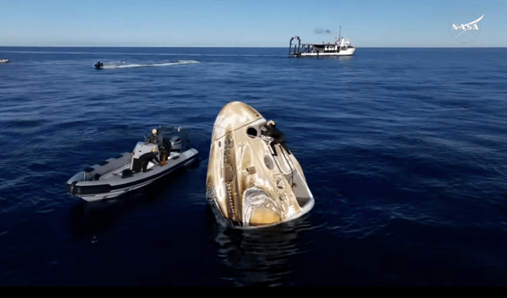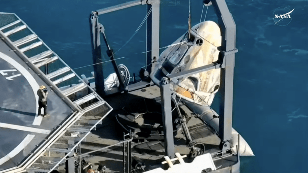 ▲太空人悉數離開太空艙被載走后,太空艙被撈起回收。NASA影片截圖