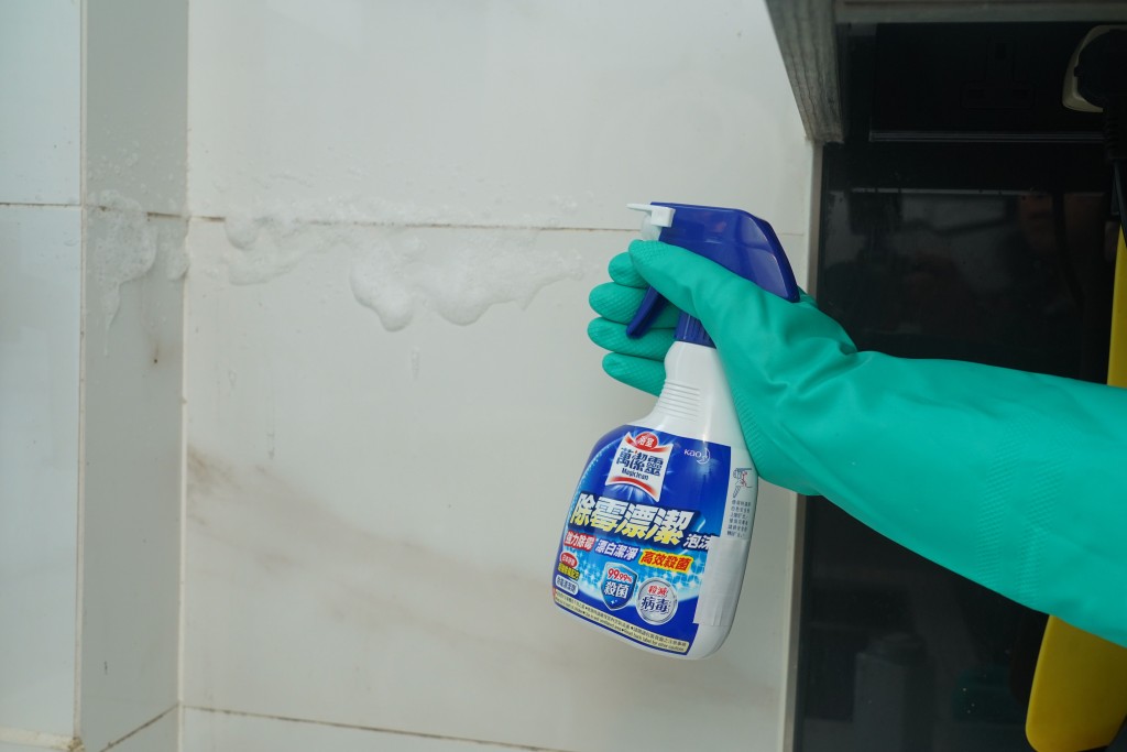 ▲用除霉噴霧直接噴上墻壁縫隙,待霉菌消失后即可沖洗。