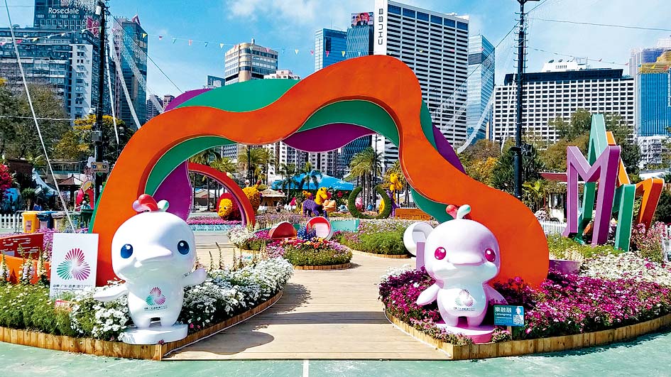 為迎接即將舉行的第十五屆全國運動會和全國第十二屆殘疾人運動會暨第九屆特殊奧林匹克運動會,花展特別以“悅”與“動”為主題,結合秋英與各色花葉植物,并設置五個與運動相關的新月形藝術裝置,賞心悅目。另外更有全運會吉祥物“喜洋洋”和“樂融融”的巨型掛幕讓市民打卡,進一步提升全城的運動熱情。