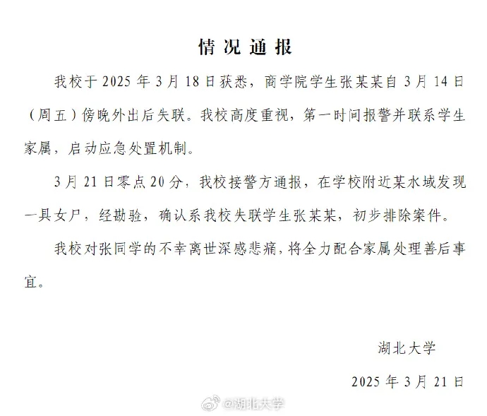 據湖北經視《經視直播》報道,趙女士介紹,她的女兒張鈺臻,19歲,來自廣東深圳,是湖北大學陽邏校區的大一學生。3月18日晚上,她們家人突然接到學校輔導員的電話,得知張鈺臻自3月15日離開學校后一直未歸。武漢市公安局長江新區分局陽邏街派出所民警表示,他們在3月18日接到學校報警后立即開始了調查工作。