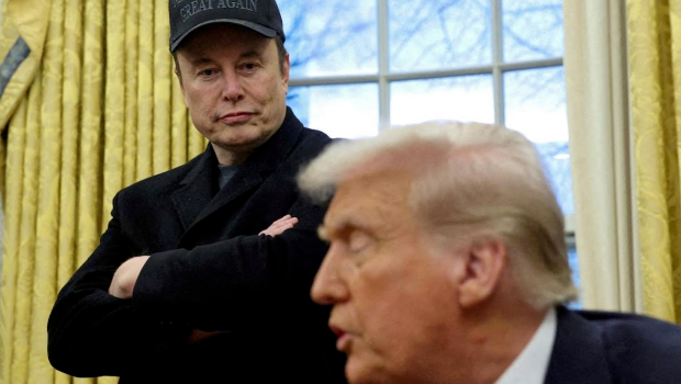 2月11日,美國華盛頓,美國總統特朗普在白宮橢圓形辦公室發表講話,馬斯克(左)在一旁旁聽。