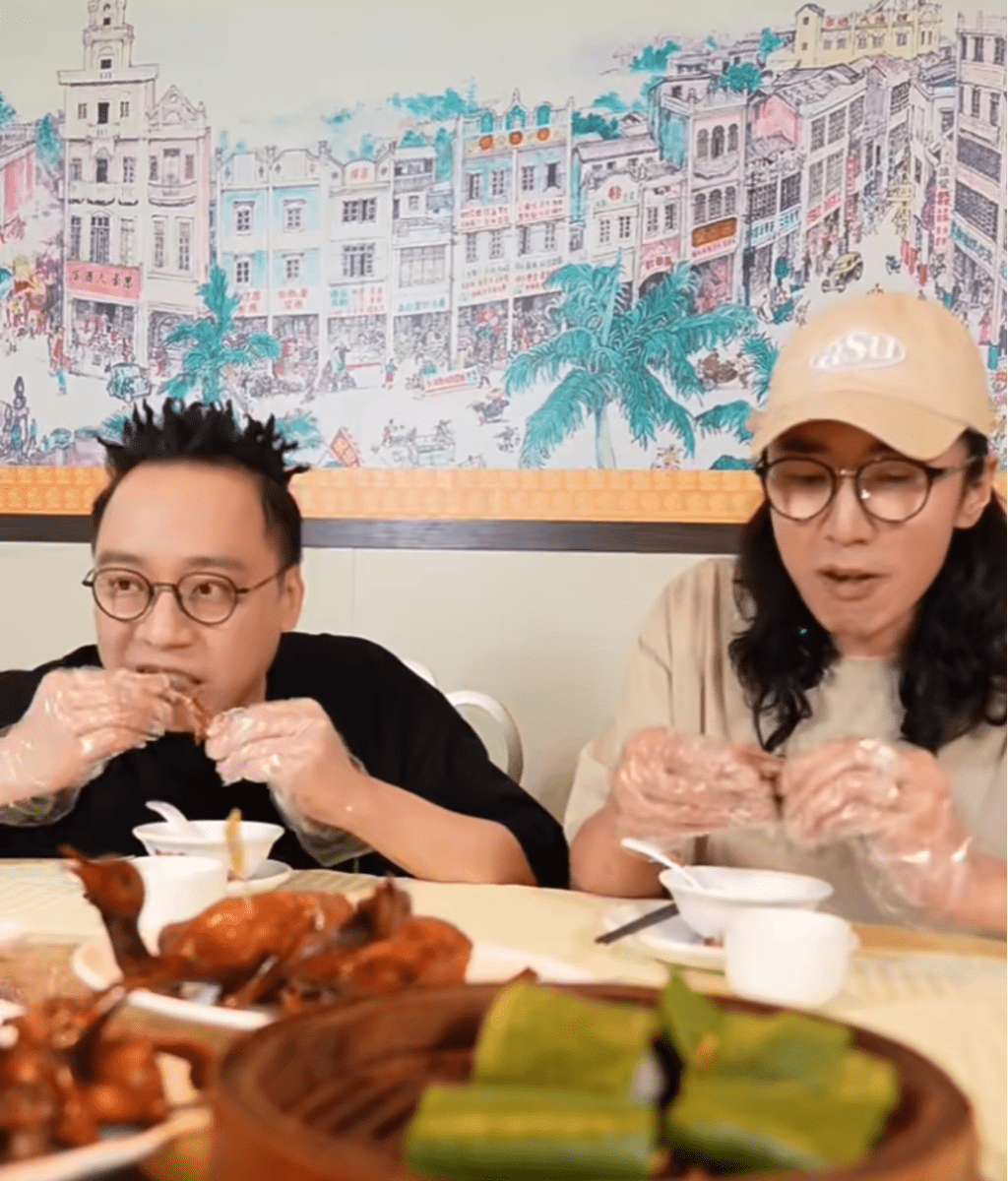 ▲中山地道美食2025|2. 石岐佬 C君、陸永吃烤乳鴿,吃得津津有味。(圖片來源:小紅書@農夫FAMA)