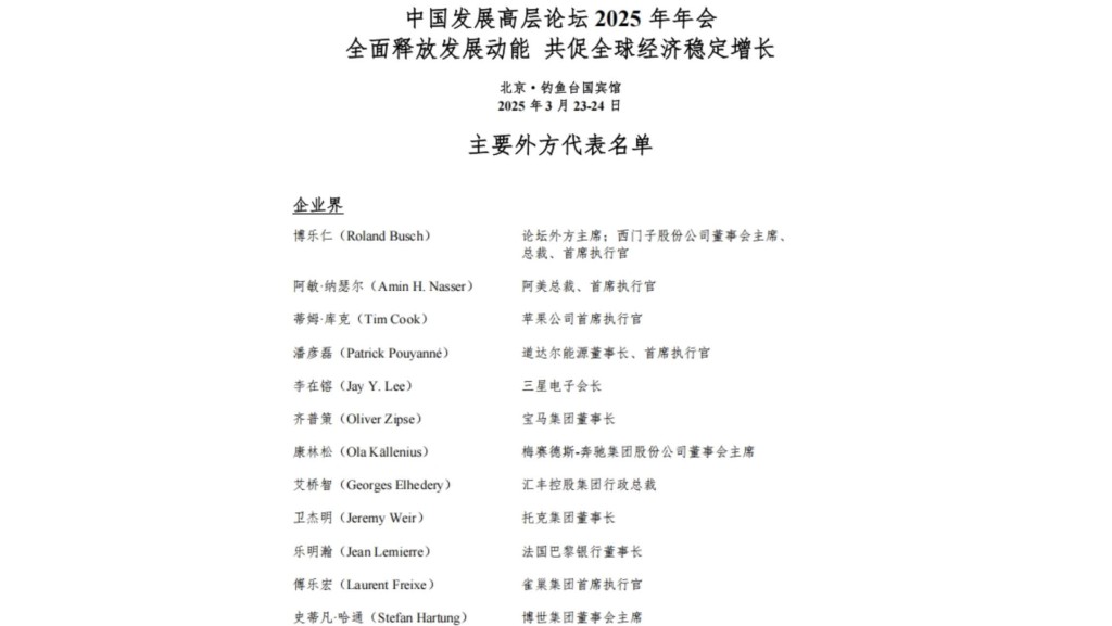 據中國發展高層論壇微信公眾號消息,中國發展高層論壇2025年年會主要外方代表名單發布,西門子股份公司董事會主席、總裁、首席執行官博樂仁(Roland Busch),蘋果公司首席執行官蒂姆·庫克(Tim Cook),三星電子會長李在镕(Jay Y. Lee),寶馬集團董事長齊普策(Oliver Zipse),梅賽德斯-奔馳集團股份公司董事會主席康林松(Ola K?llenius),高通公司總裁、首席執行官安蒙(Cristiano Amon)等80多名跨國公司代表將參加。