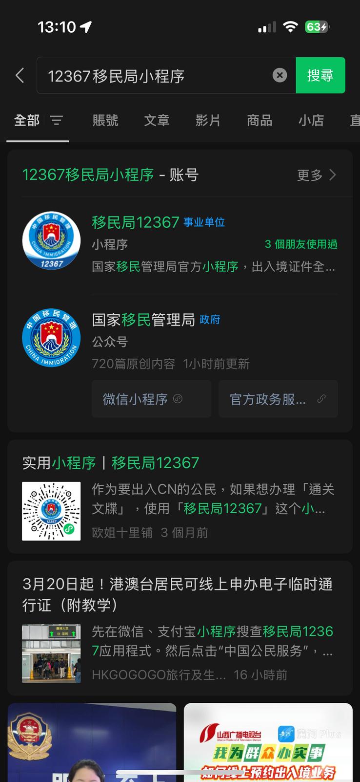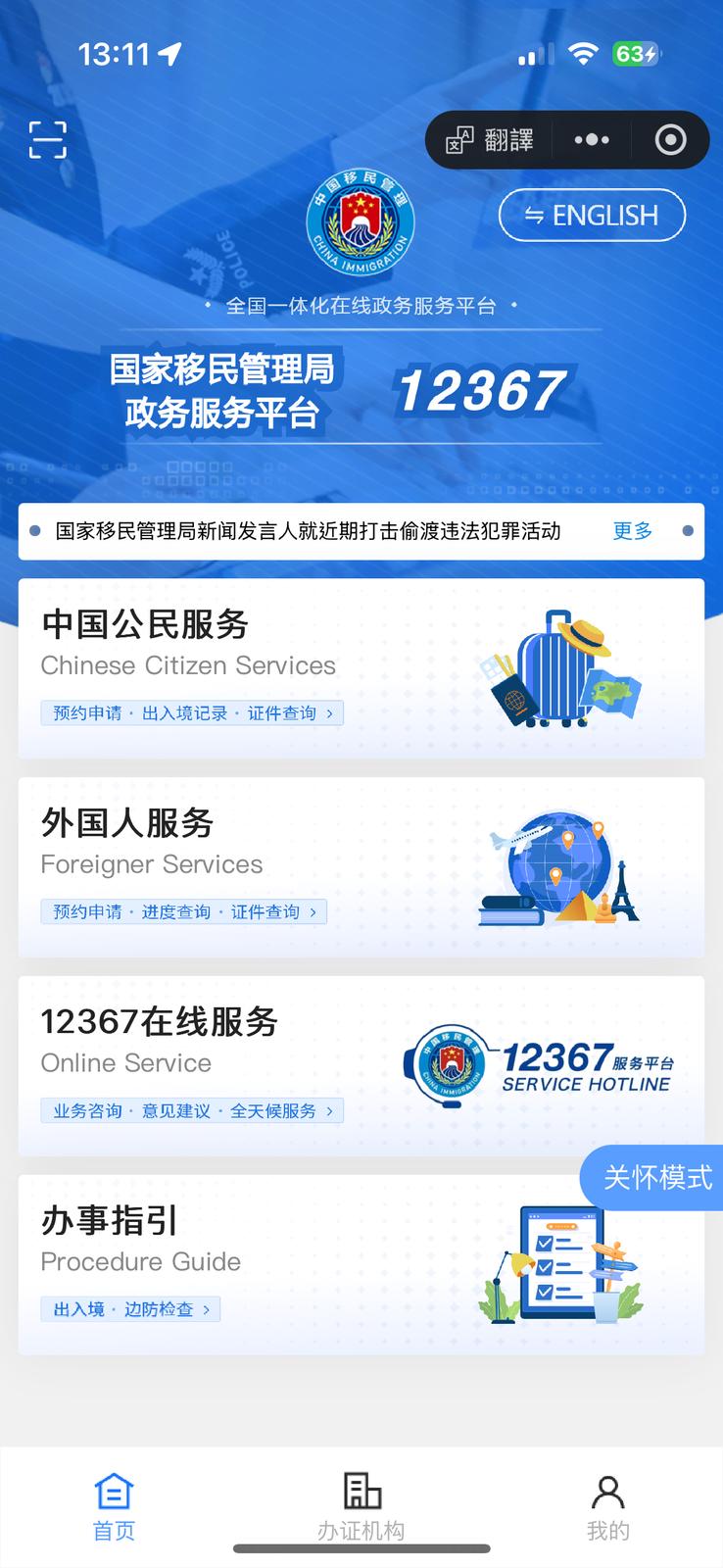 在微信或支付寶小程序搜索“移民局12367”的應用程序
